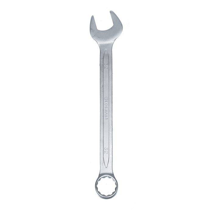 Ключ комбинированный 32 мм КОБАЛЬТ 643-002, предназначен для отвинчивания/завинчивания мелкого резьбового крепежа с шестигранными головками при производстве строительных, электротехнических, монтажных и автосервисных работ. Изготовлен по стандарту DIN 3113 из хром-ванадиевой стали Cr50BV30, с закалкой рабочих поверхностей до 47-50 HRC. Защитное матовое хромовое покрытие ключа, нанесенное электролитическим способом, предохраняет от коррозии, улучшает внешний вид, при этом ключ не скользит в ладони в процессе работы. универсальный гаечный ключ, состоящий из двух рабочих профилей - рожкового и накидного. Используется при проведении слесарно-монтажных работ на производстве, в автомастерских и в быту.