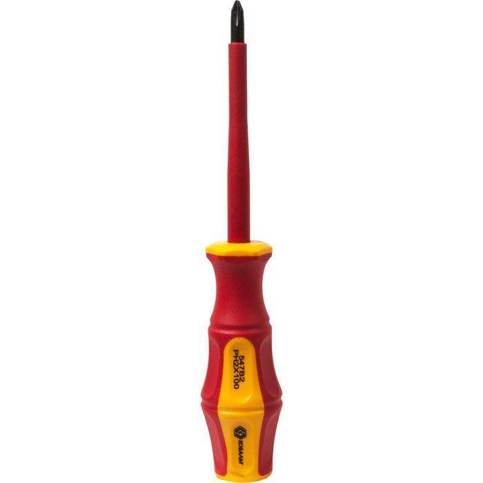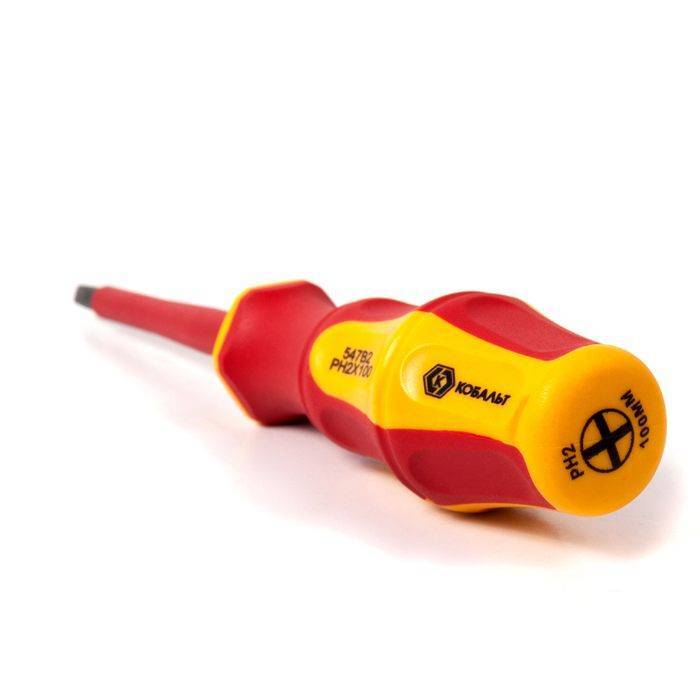 Отвертка диэлектрическая крестообразная PH-2 х 100мм КОБАЛЬТ 646-508 предназначена для завинчивания/отвинчивания винтов, шурупов и саморезов находящимися под напряжением до 1000 Вольт.при проведении строительно-монтажных работ, сборки/разборки, ремонта различных механизмов, узлов и агрегатов. Изготовлена из хром-ванадиевой стали 6150CrV с закалкой рабочей части 51-54HRC. Стержень отвертки дополнительно изолирован. Специальная двухкомпонентная рукоятка из комбинации резины и пластика "Ultra Grip" имеет идеальную анатомическую форму, что позволяет передавать максимально возможный для руки человека крутящий момент, снижает усталость кисти, исключает натирание ладони. Рукоятка выполнена из масло-бензостойких материалов, не засаливается и легко протирается тряпкой. Отвертка не скатывается с умеренно наклонной поверхности. Шлиц отвертки намагничен для удобного удержания мелкого крепежа. Длина общая/рабочая 205/100мм, тип шлица PH-2.