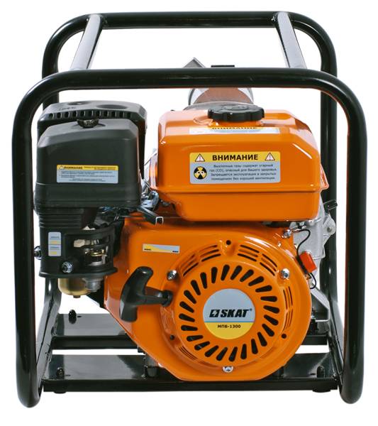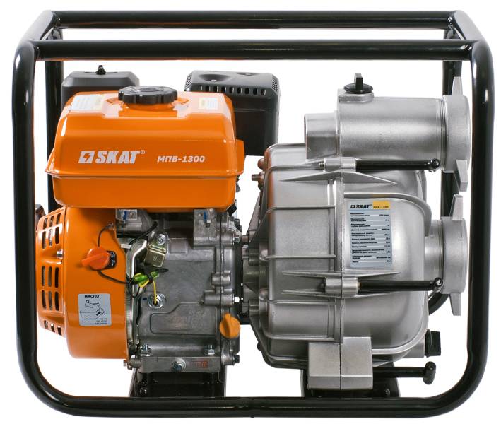 Мотопомпа МПБ-1300 предназначена для перекачивания загрязнённой воды, в которой содержатся частицы песка, листьев и других примесей размером до 25 мм. Для быстрой очистки механизма насоса от засорения, предусмотрена его ускоренная разборка. Даже при отсутствии слесарного инструмента корпус насосной части легко разъединяется благодаря применению шпилек с рукоятками. Грязевая мотопомпа способна перекачивать и чистую воду. Для откачивания грязной жидкости с консистенцией загрязнения подобной сметане эта мотопомпа не подходит. Для таких работ предусмотрены специальные насосы другой конструкции. Повышенный ресурс работы обеспечивают износостойкие детали: улитка и крыльчатка помпы отлиты из чугуна, а на вал двигателя установлен керамический сальник.