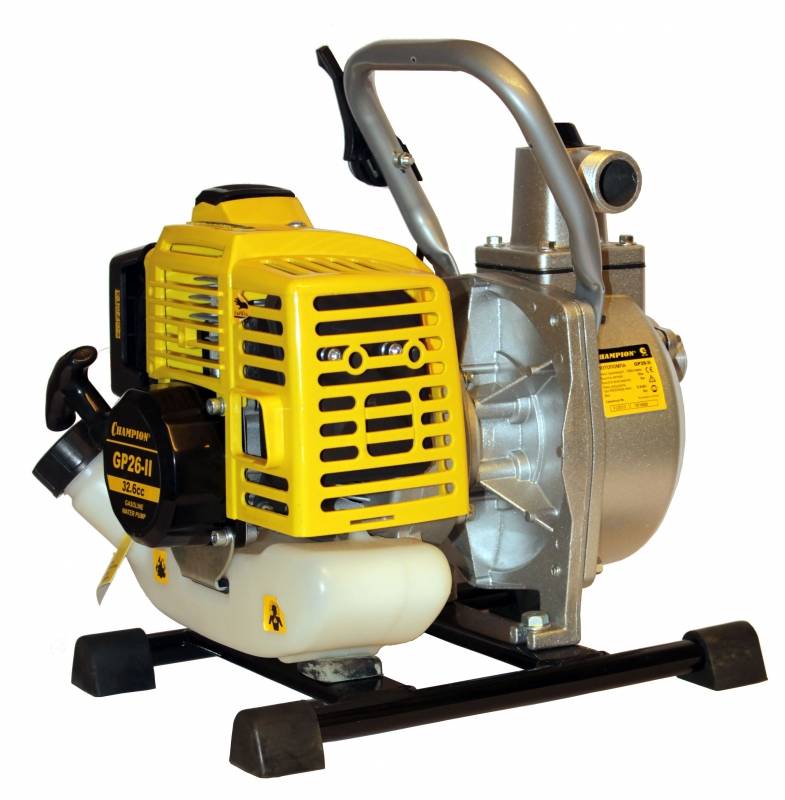 Мотопомпа CHAMPION GP26-II - агрегат для перекачивания и подачи воды на хозяйственные участки и сады. Оснащена одноцилиндровым 2-тактным двигателем мощностью 1.22 л.с., который работает на смеси бензин/масло. Наличие топливного насоса обеспечивает легкий и быстрый запуск мотора. Агрегат установлен на прочную раму из металла для устойчивости на любой поверхности. Вес - всего 6.84 кг. В конструкции предусмотрена рукоятка для транспортировки мотопомпы.
