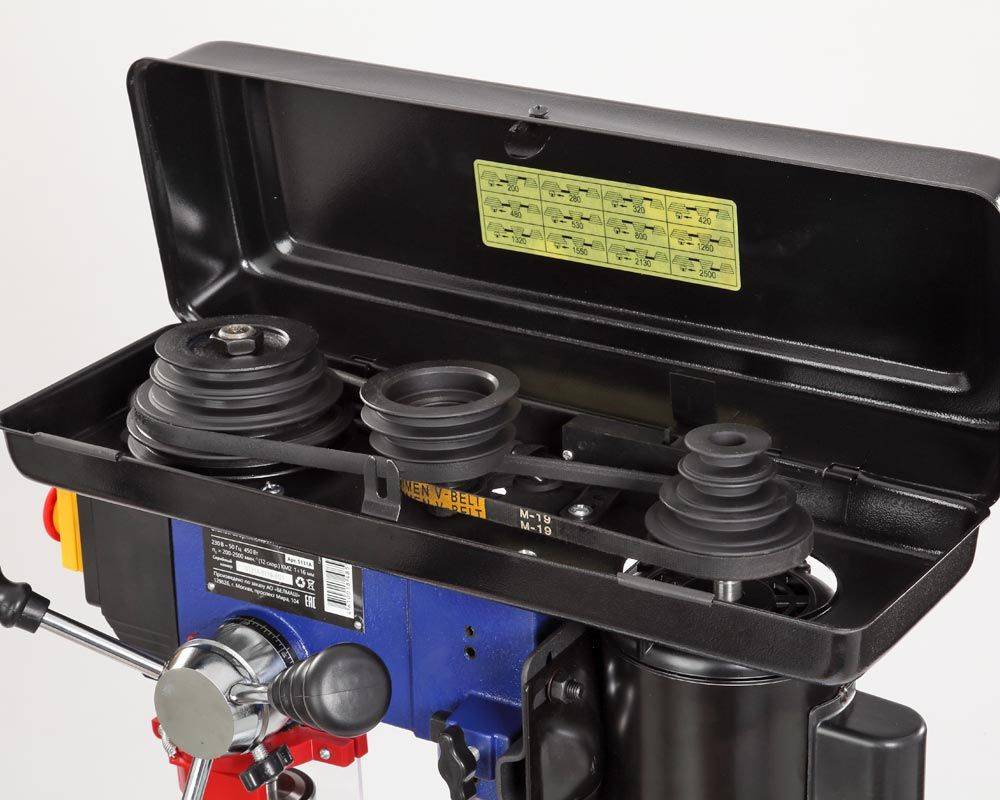 Имеется двенадцать ступеней скорости вращения шпинделя, что необходимо при выполнении различных операций и типах материала. Переключение производится за счет переброски ремня. Для этого необходимо открыть крышку ременного отсека, ослабить барашек крепления двигателя, тем самым получив возможность смещения шкива, перекинуть ремень и проделать операцию в обратной последовательности.