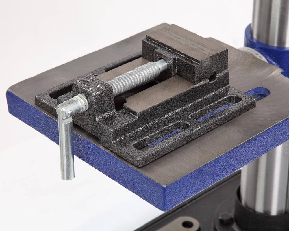 Заготовку можно крепить как к рабочему столу, так и к основанию, все зависит от ее размера. В комплекте предусмотрены тиски. Для их крепления есть по два паза на рабочем столе и на основании. Шкала, расположенная на рукоятке регулировки глубины сверления, показывает ход пиноли шпинделя, с ее помощью можно настраивать ход пиноли, для этого необходимо провернуть шкалу, стрелка на корпусе будет показывать значение, на которое будет возможно погружение сверла, затем затянуть барашек. Наконечники тройной рукояти удобной формы, что способствует плавной подаче сверла к заготовке.