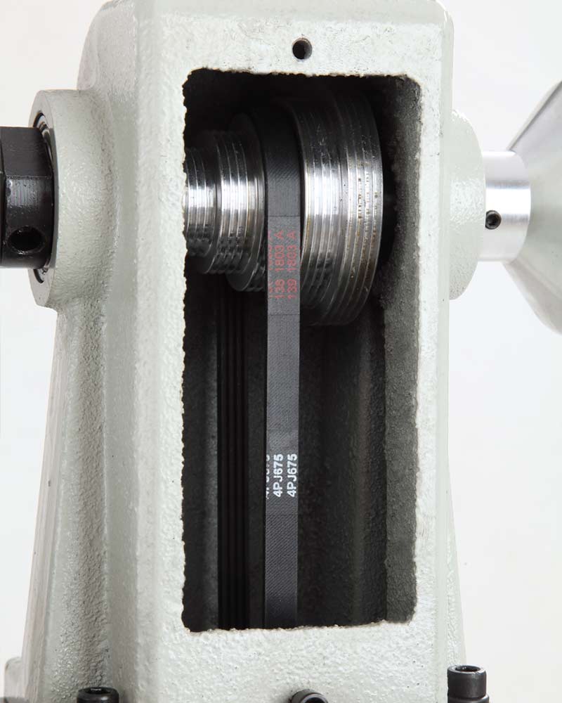 Чтобы сменить диапазон скорости вращения достаточно ославить затяжку крепления положения двигателя, приподнять его, сменить положение приводного ремня, вернуть в исходное положение двигатель и зафиксировать. -
