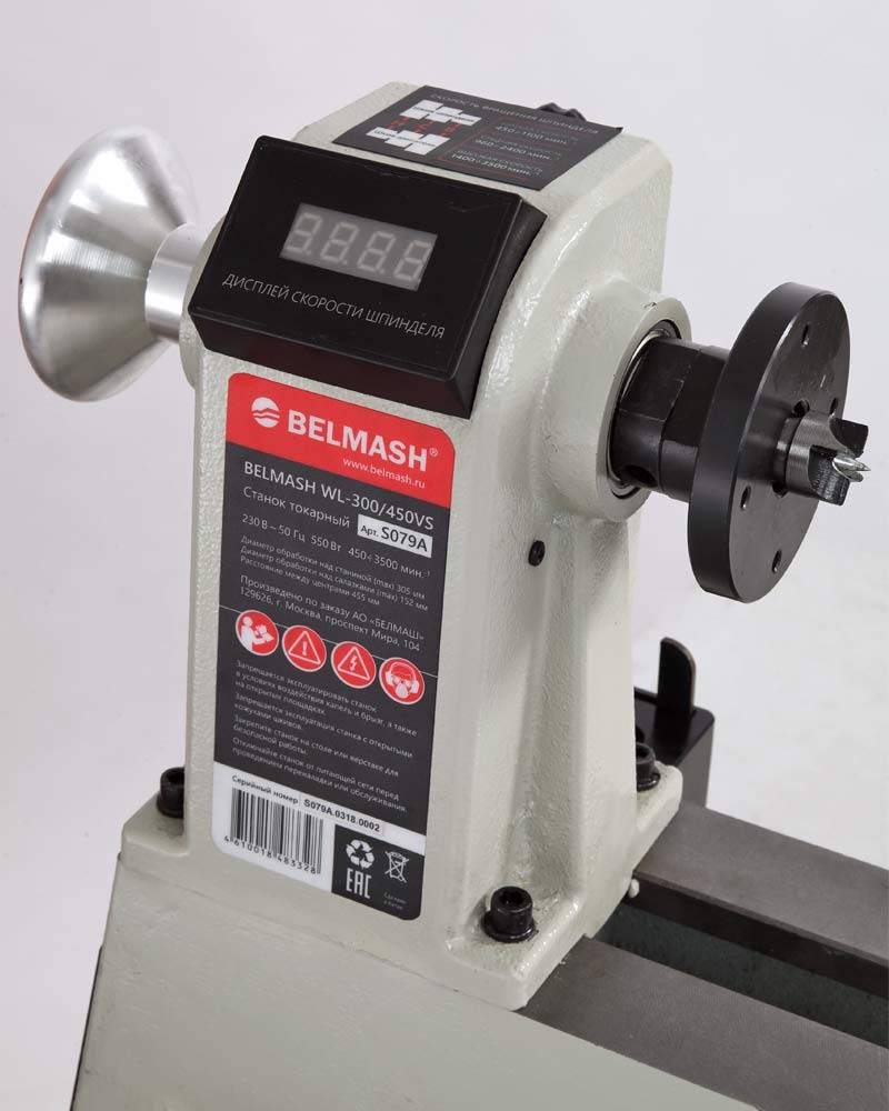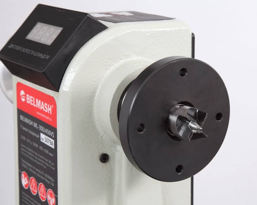 Шпиндель передней бабки вращается в трех диапазонах скоростей - 450÷1100/960÷2400/1400÷3500, в зависимости от расположения ремня на ступенях шкивов. Для индикации скорости предусмотренно табло.